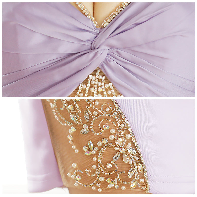 A tight mini dress accented with sparkling bijoux and pearls on the front.