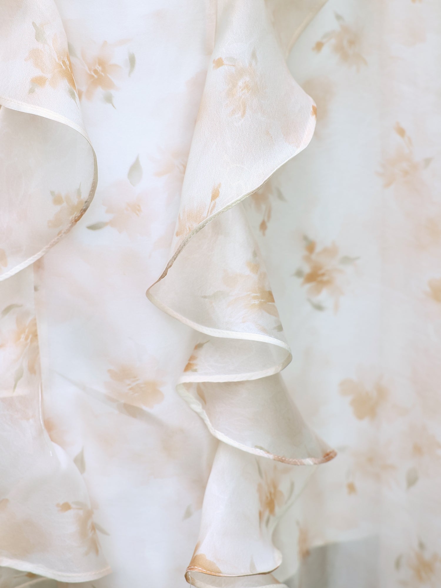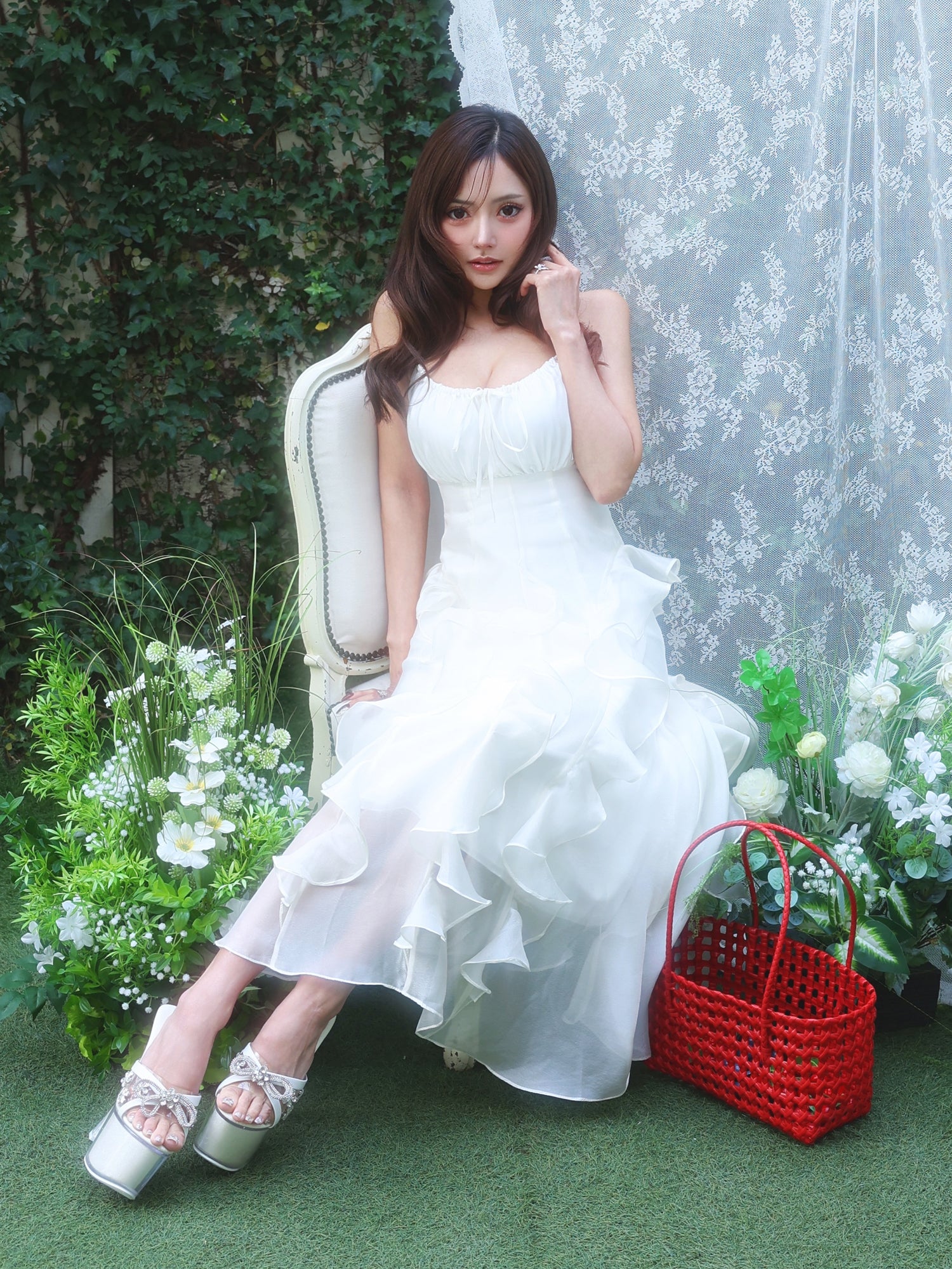 揺れ感のあるフリルデザインが動くたびに表情を変え、特別なシーンにも映える一着です。