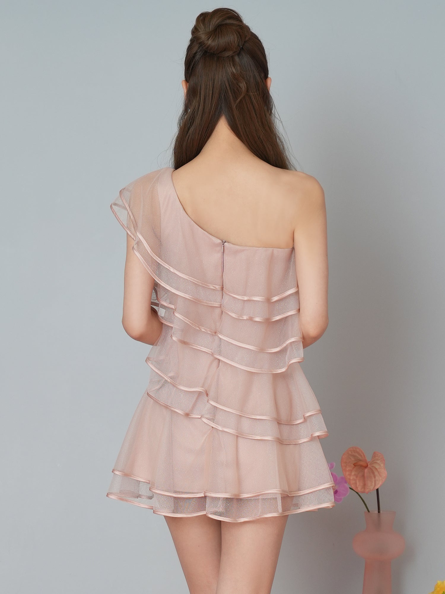 ワンショルダーデザインと段フリルが、女性らしい立体感と動きを演出。。