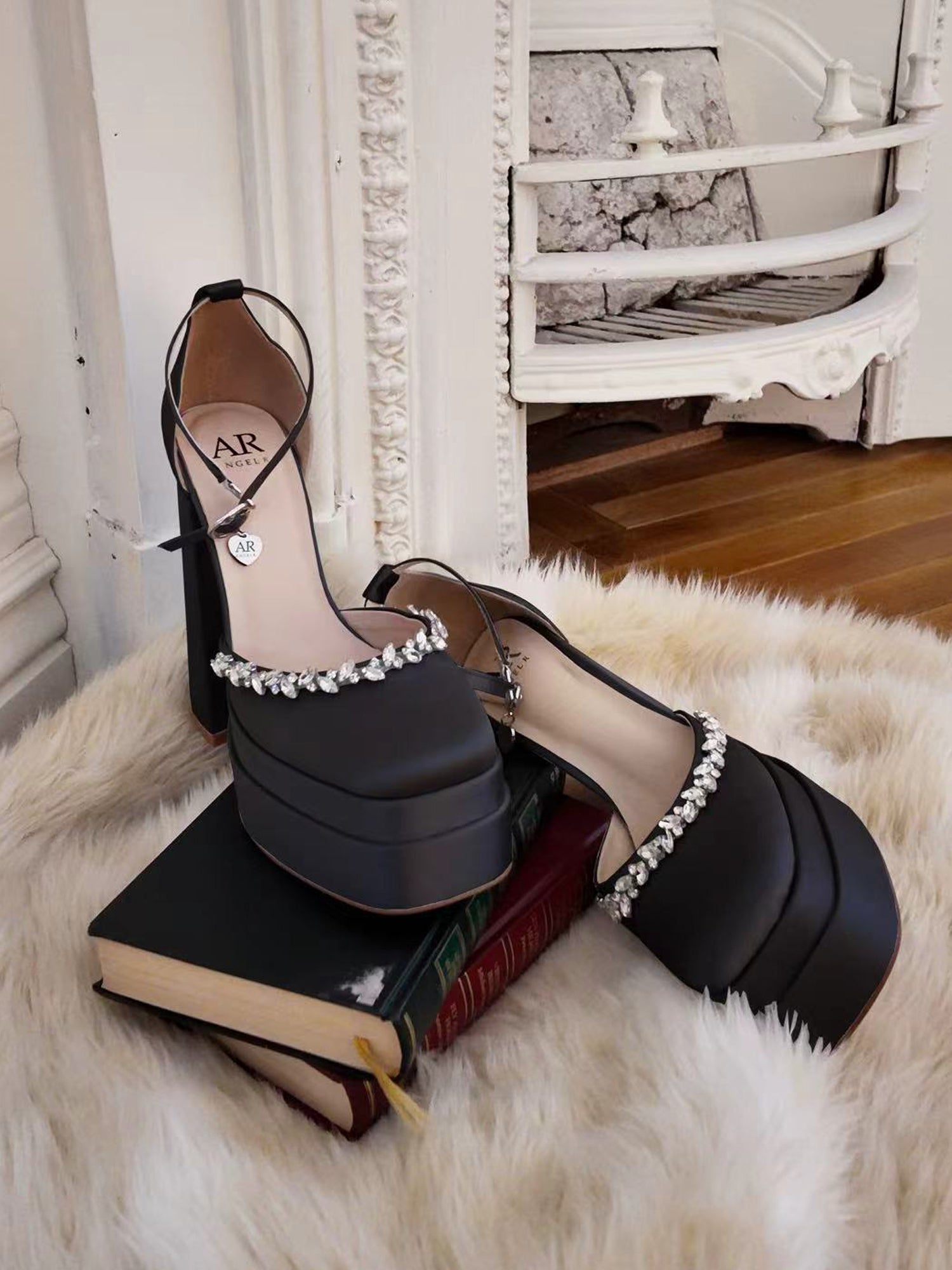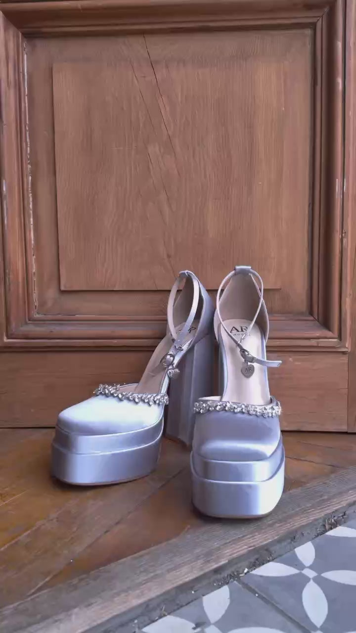 甲にあしらったビジューラインが輝く、サテン素材のラグジュアリープラットフォームパンプス。
