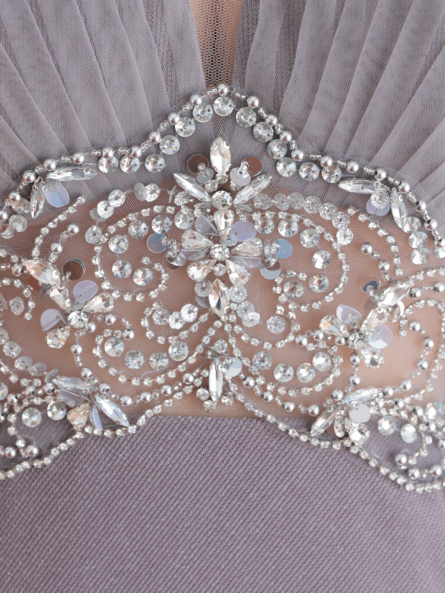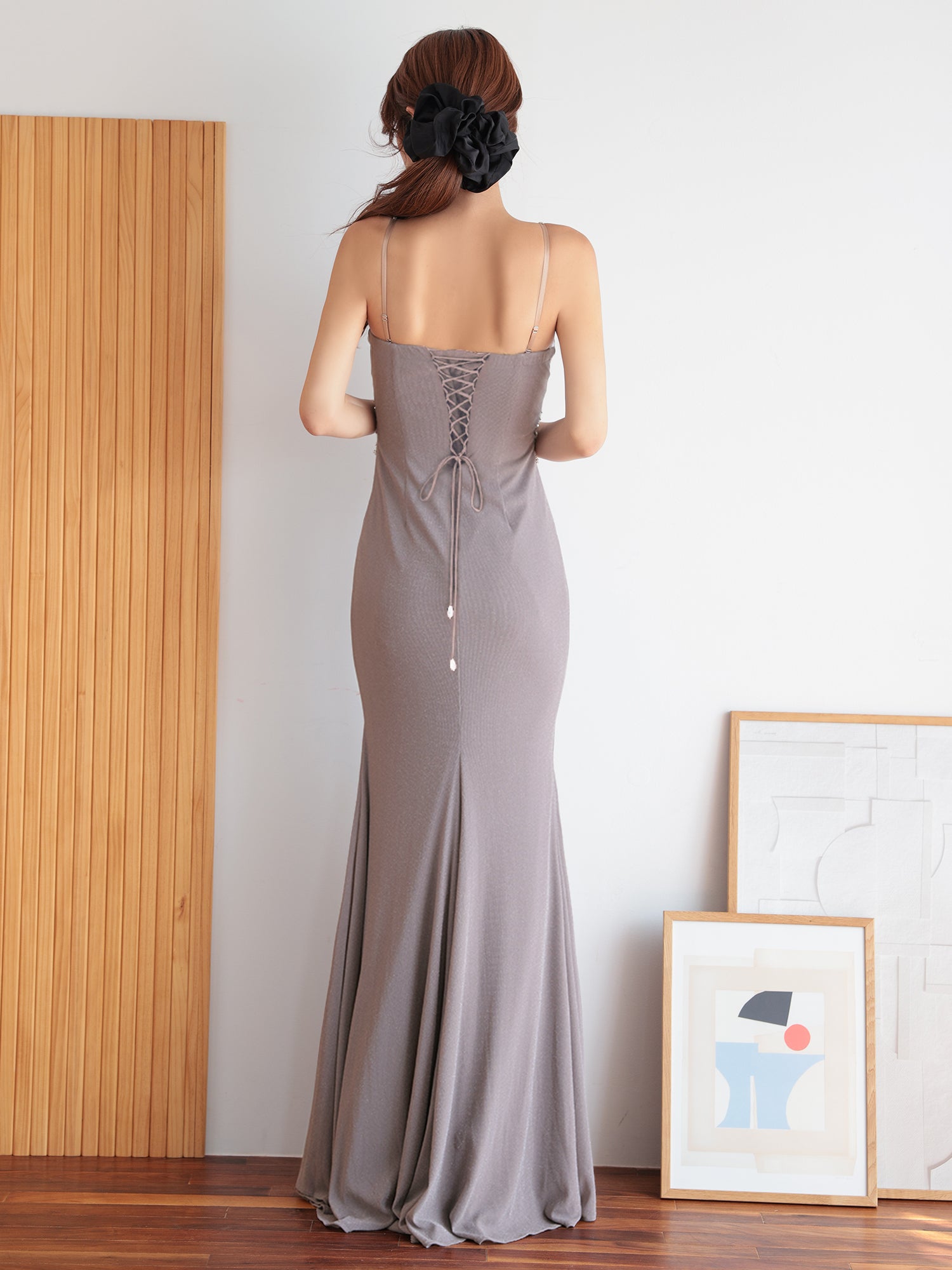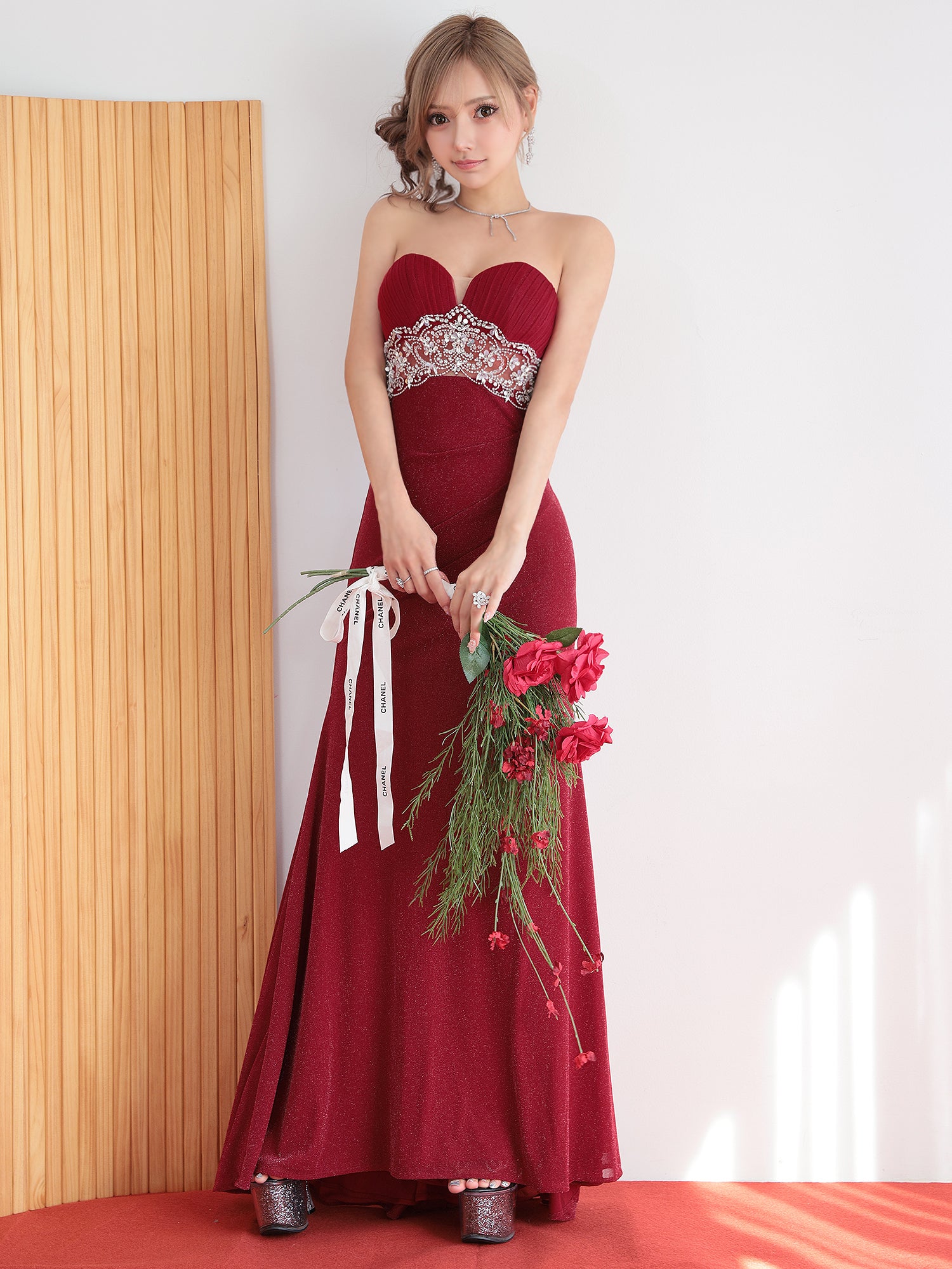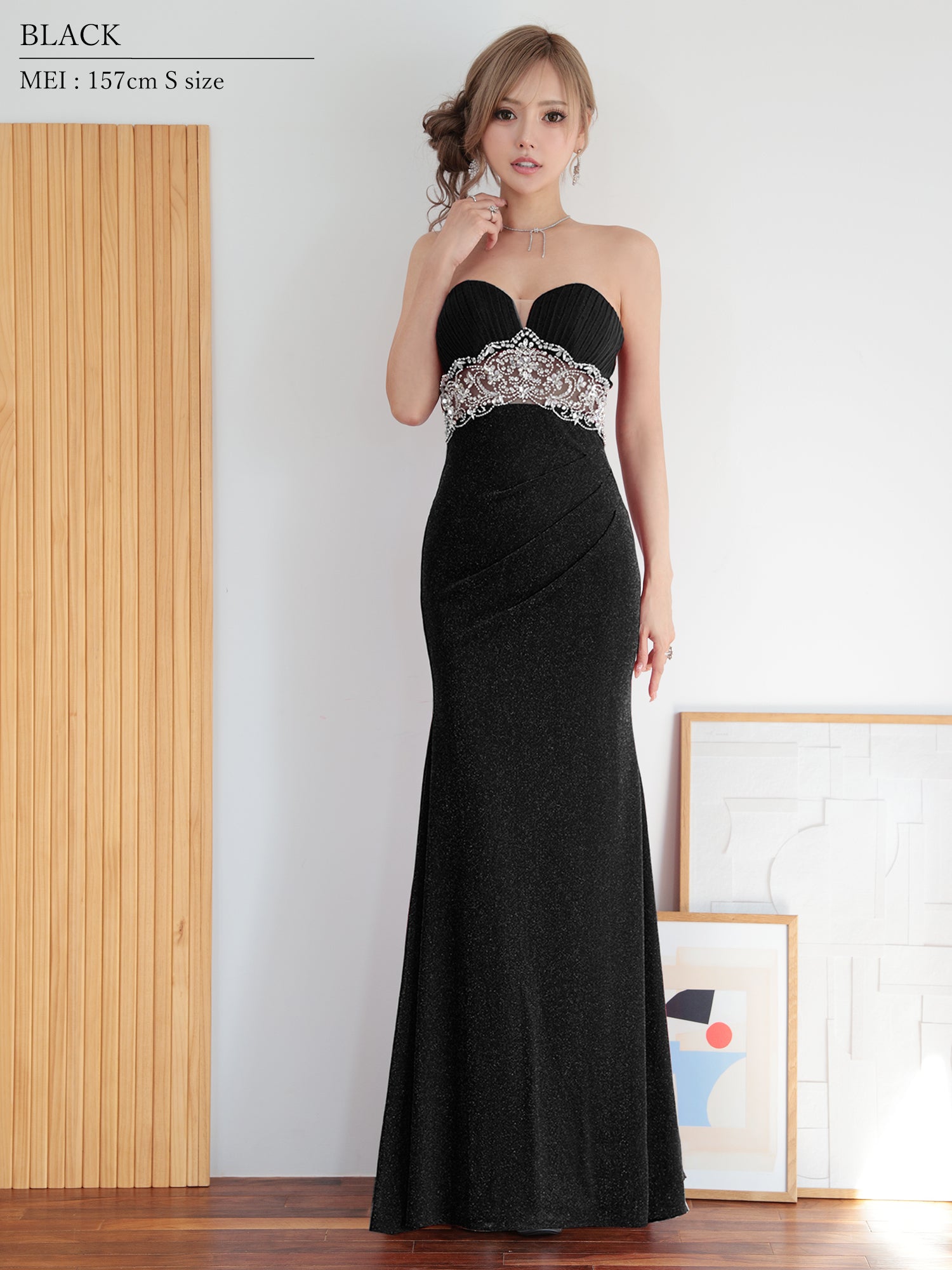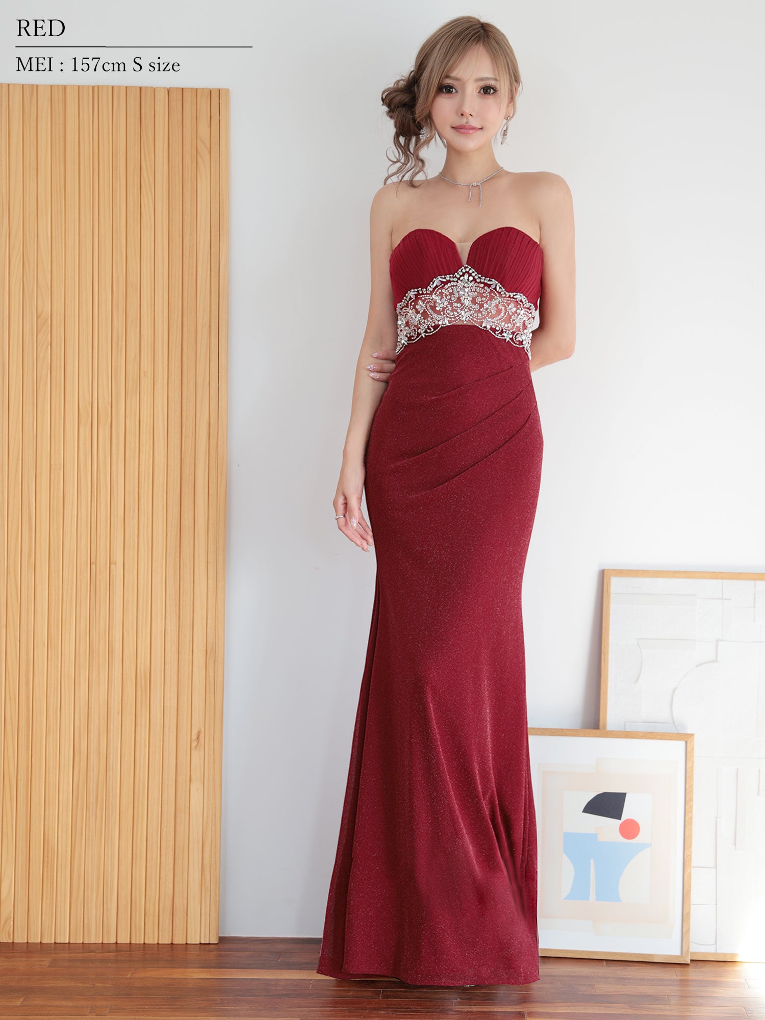 ベアトップ/ウエストビジュー/メッシ/タック/タイト/ロングドレス